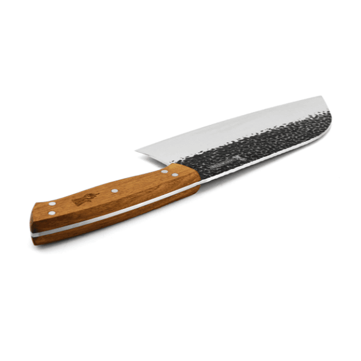 Las características del machete parrillero 8" de acero inoxidable y carbono martillado son: